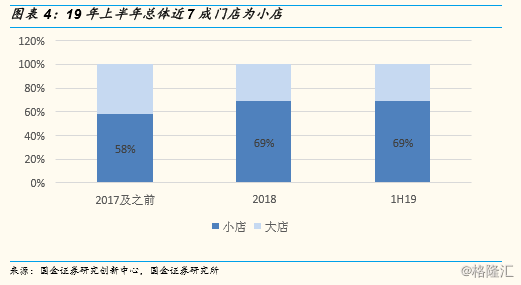 此外,我们注意到一个明显的趋势是,不管是高线城市还是低线城市,新开店的门店面积逐渐变小。从国金研究创新中心跟踪的数据来看,最小的门店面积约400平米,大店则最大面积超过2000平米。我们以面积900平米作为划分小店和大店的依据进行统计。结果显示,2018年以及19年上半年开出的门店中,小店占比接近7成。根据我们草根调研的信息,小型门店平均容纳桌位数在65张左右,大型店平均容纳85张桌子。在实际运营中,不同门店会按照周边客流量情况和消费群结构,合理配置大、中、小桌的比例,但总的来说我们认为单店面积和平均单店桌位数总体呈下降趋势。