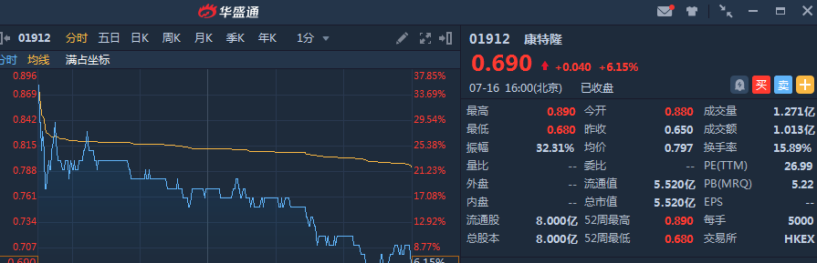 康特隆(01912)首日挂牌港交所,开盘涨35.38%。截止收盘,康特隆收涨6.15%,报价0.69港元,若以发行价买入,一手赚200港元,成交额1.013亿,市值达5.52亿港元。