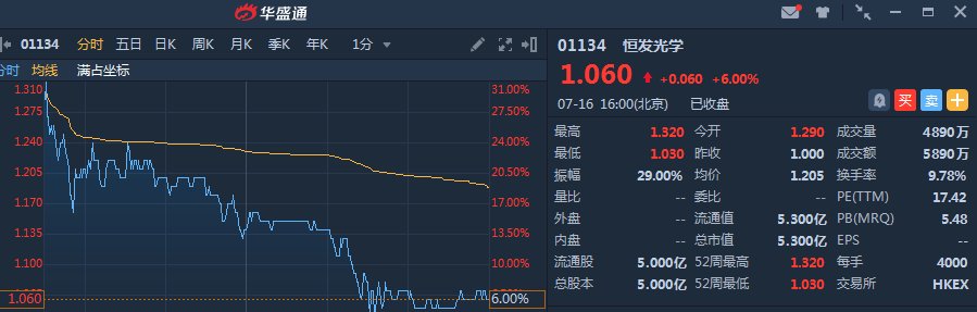 恒发光学(01134)首日挂牌港交所,开盘涨29%。截止收盘,恒发光学收涨6.00%,报价1.06港元,若以发行价买入,一手赚240港元,成交额5890万,市值达5.3亿港元。