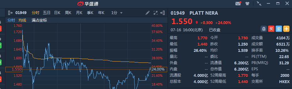 PLATT NERA(01949)首日挂牌港交所,开盘涨38.4%。截止收盘,PLATT NERA收涨24.00%,报价1.55港元,若以发行价买入,一手赚600港元,成交额6521港元,市值达6.2亿港元。