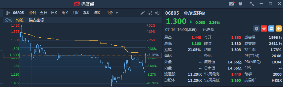 金茂源环保(06805)首日挂牌港交所,开盘涨1.50%。截止收盘,金茂源环保收跌2.26%,报价1.3港元,若以发行价买入,一手蚀60港元,成交额2611万,市值达14.56亿港元。