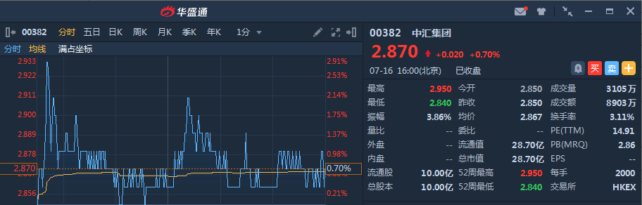 中汇集团(00382)首日挂牌港交所,股价平开。截止收盘,中汇集团收涨0.7%,报价2.87港元,若以发行价买入,一手赚40港元,成交额8903万,市值达28.70亿港元。