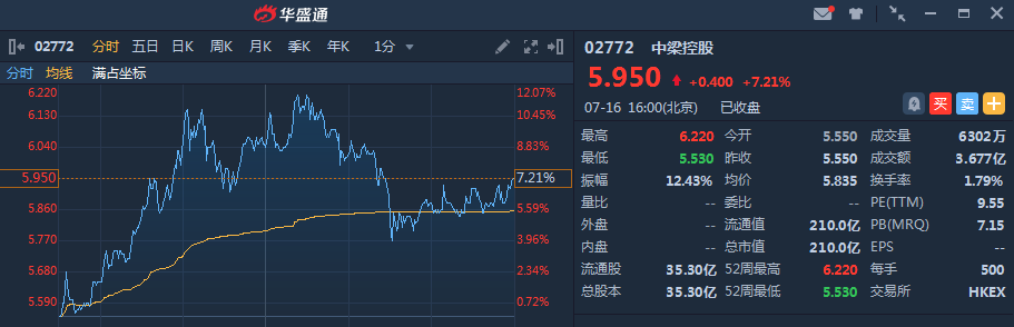 中梁控股(02772)首日挂牌港交所,股价平开。截止收盘,中梁控股收涨7.21%,报价5.95港元,若以发行价买入,一手赚200港元,成交额3.677亿港元,市值达210亿港元。