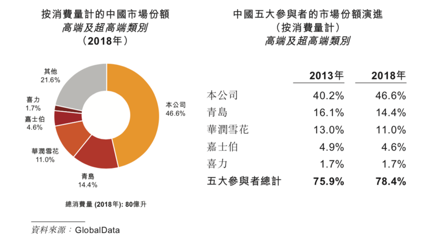 根据GlobalData的资料, 2018年华润雪花在消费量仍占据中国23.3%的市场份额,就整体市场份额而言,公司对其他参与者保持绝对的优势地位。