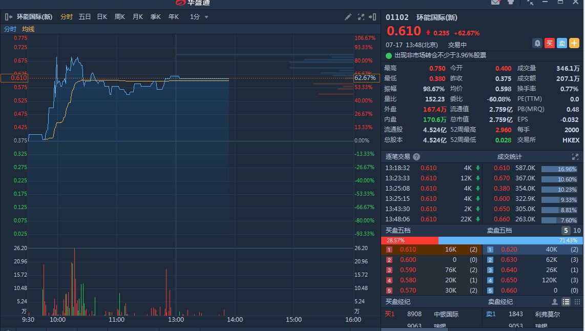 智通财经APP获悉,环能国际(01102)早盘逆势飙升,一度涨超84%,截至发稿,涨幅回落至62.67%,报0.61港元,成交额达205.6万港元。环能国际(01102)早前建议股份20合1,每手买卖单位维持2000股。不过港交所总裁李小加曾在其一篇针对老千股的文章《关于“老千股”》中给过一个定义:“老千股”是指那些存在“大股东不以做好上市公司业务来盈利、而主要通过玩弄财技和配股、供股与合股等融资方式损害小股东利益”现象的股票。