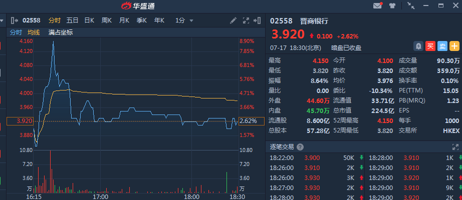 晋商银行(02558)今日暗盘收报3.92港元,较发行价3.82港元涨2.62%,每手赚100港元,成交额359万港元,总市值为224.5亿港元。
