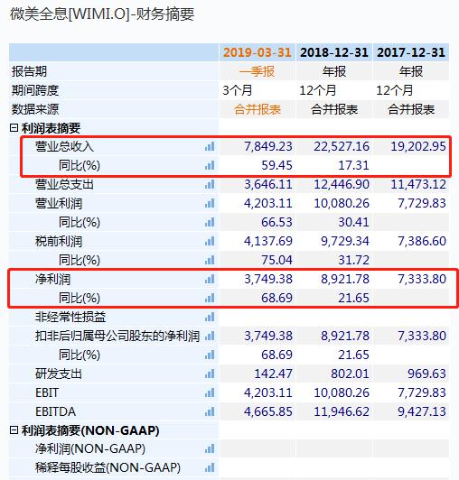 尽管作为一只2015年才成立的科技公司,但微美竟然是以盈利的姿态上市的。微美在2018年净利润为8921万元,同比2017年增长21.65%。2019年一季度净利润则为3749万,同比增长68.69%,这家公司从2017年以来从未亏损。