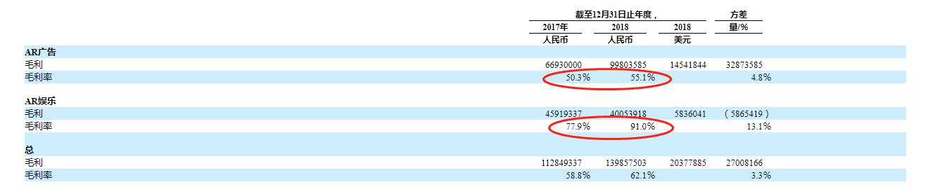 从业务分解来看,2018年微美的AR广告业务毛利率为55.1%,AR娱乐业务毛利率高达91%。那么为啥微美盈利能力这么强呢?根据Frost & Sullivan的数据,2018年,微美在国内所有全息AR解决方案提供商中建立了最全面、最多元化的全息AR内容库,在收入、客户数量、全息AR内容以及全息AR专利和软件著作权数量方面,微美全息云在中国全息AR行业排名第一。截止2018年,微美全息云拥有大约4654个AR全息内容、106个软件版权和219个技术专利。可以说微美的AR技术,目前在国内有着很强竞争力。