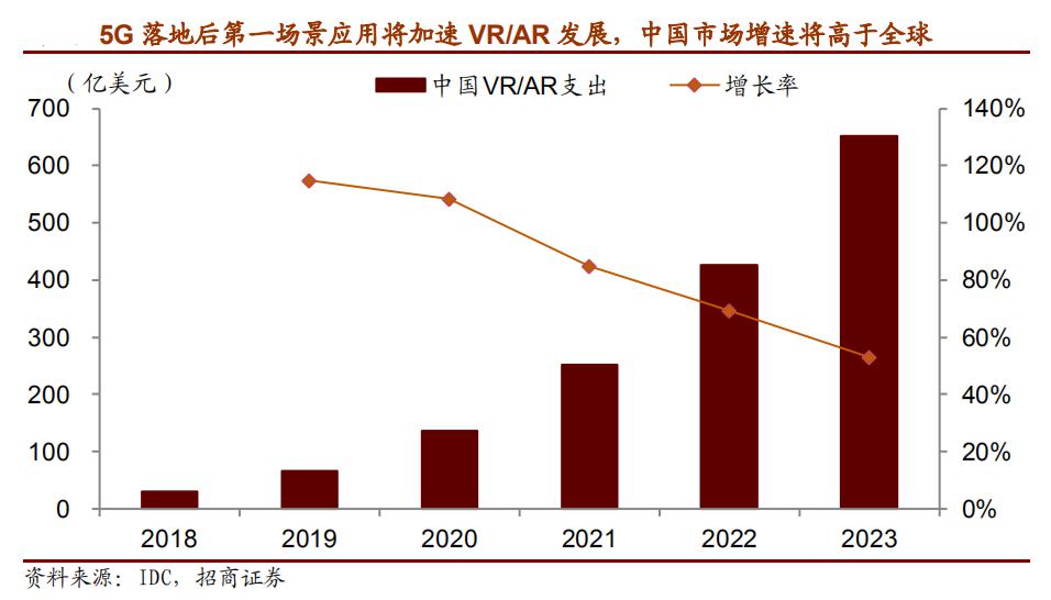 根据IDC最新的《IDC全球增强与虚拟现实支出指南》,至2023年中国AR和VR市场支出规模将达到652.1亿美元,同时2018年-2023年年复合增长率将达到84.6%,高于全球增长率的78.3%。有专家预测5G落地后,第一场景应用将加速VR和AR的发展,而我国在这块有着先发优势。