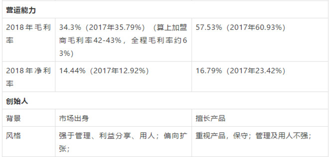 下面对于行业内头部双雄进行一个比较,同时也是直营与加盟模式的对比: