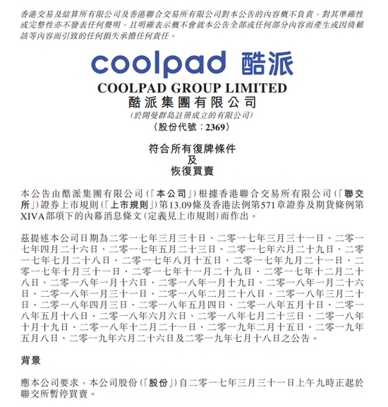 酷派集团:符合所有复牌条件 申请7月19日起恢复交易