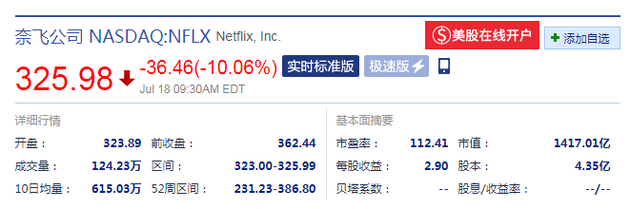 新浪科技讯 7月18日晚间消息,Netflix开盘大跌10.64%,报323.89美元。