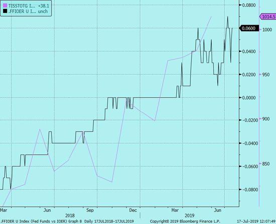 联邦基金利率与超额准备金率息差(黑色) vs 美国国债发行(紫色)