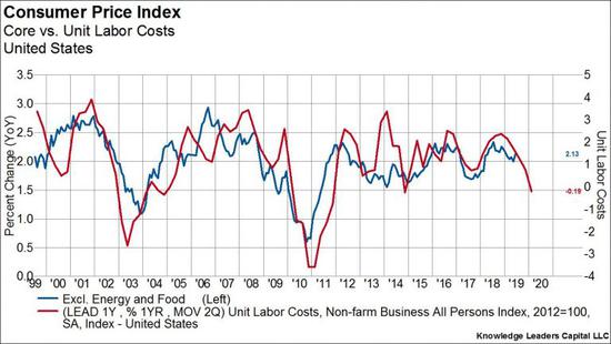 通胀:上周核心CPI同比增长2.1%,此前的预期为2%。核心PPI同比增长2.3%,预计为2.2%。现在,中间产品价格仅以1%的速度增长,而初期产品价格同比下降5%。也就是说,价格正在逐步回落。价格高于预期表明经济有点衰弱。不过,这些数据同样也是滞后指标。单位劳动成本领先核心CPI一年,而单位劳动成本自2010年和2014年首次出现负增长。这表明,到2020年中,价格压力将会减弱。