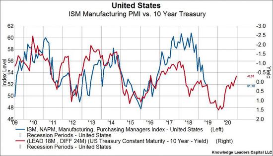 ISM前景:因为ISM是主要的经济指标,关注ISM报告目前的水平,可以预测其他经济变量的方向。但是,知道利率变化如何影响滞后的经济增长率,也能预测ISM这一领先指标的中期方向。