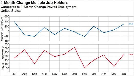 更令人震惊的是,总就业人数增加了7.7万,从事多项工作的人数增加了30.1万,超过了总新增就业人数。只从事一项工作的人数减少了7.7万,这表明从事兼职的人群促进了6月总就业人数的增长。