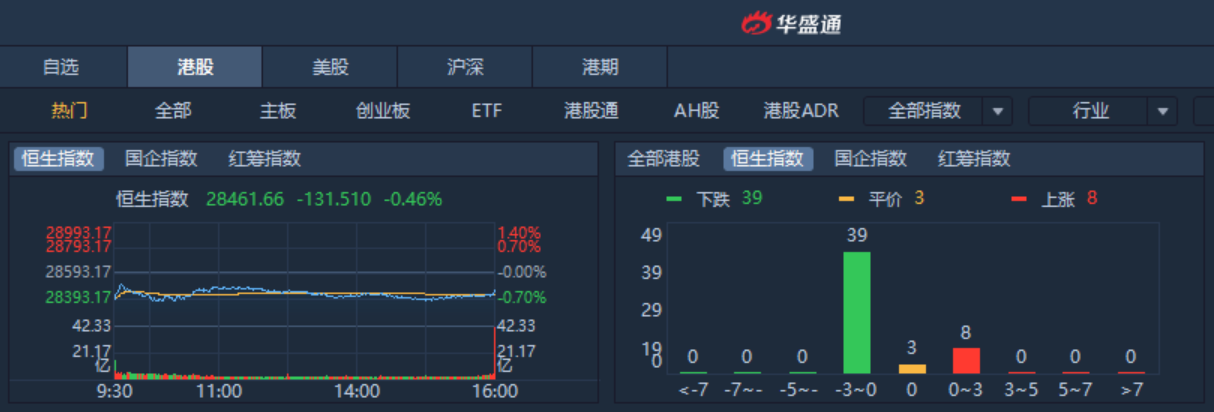 周四,恒指早盘低开,整体维持弱势盘整走势,尾市市场情绪有所转暖,小幅反弹收窄跌幅。截至收盘,恒生指数跌0.46%,报28461.66点,全日成交额达605.8亿。国企指数跌0.58%,报10784.55点,红筹指数跌0.46%,报4427.22点。