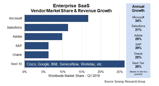 从全球云服务的市场来看,SaaS市场的收入规模比IaaS和PaaS之和还大,根据Synergy数据显示,微软凭借17%的市场份额在企业SaaS市场占有第一。