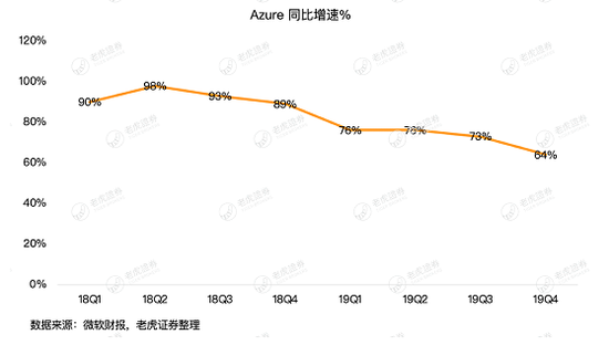 第四季财季,Azure收入同比增长64%,却是Azure过去4年最慢的季度增速。此前公司已经给予一定放缓预期,不是需求衰减,主要由于及基数规模不断扩大。2018年收入257亿美元的亚马逊AWS服务上季度增速为41%。