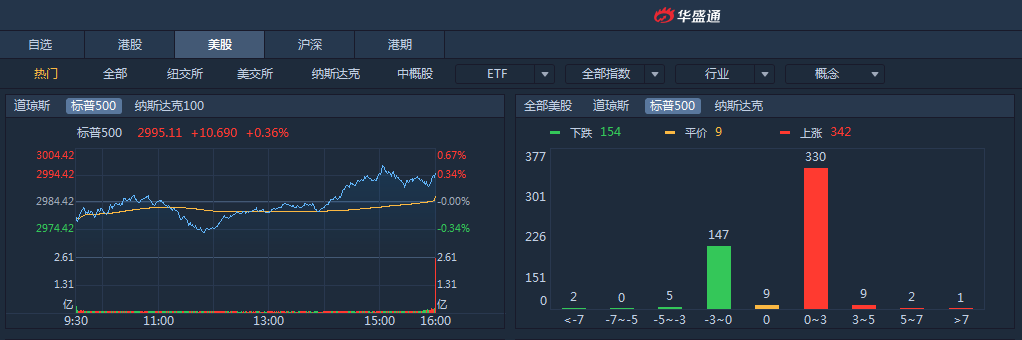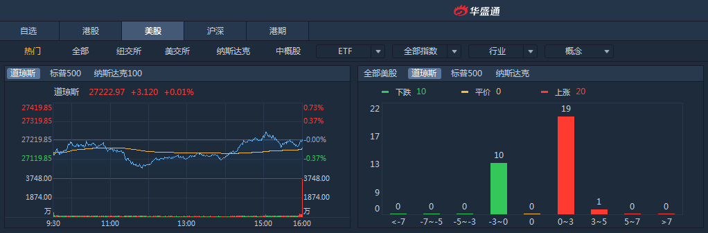 周四,全球降息浪潮提振美联储降息预期,三大股指微幅收涨。道指涨0.01%,报27222.97点;标普500指数涨0.36%,报2995.11点;纳指涨0.27%报8207.24点。