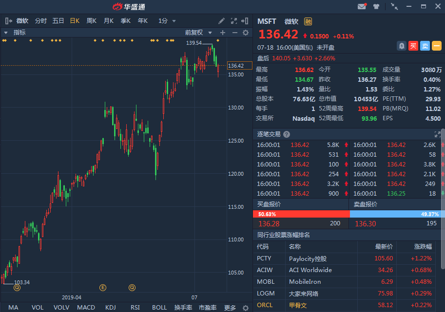 全球市值第一的巨头微软(周四收于10453亿美元)新发财报,CEO评价其为微软创纪录的财年,第四季度是一个强力的收尾。因业绩超预期,盘后股价上涨2.66%至136.42美元。