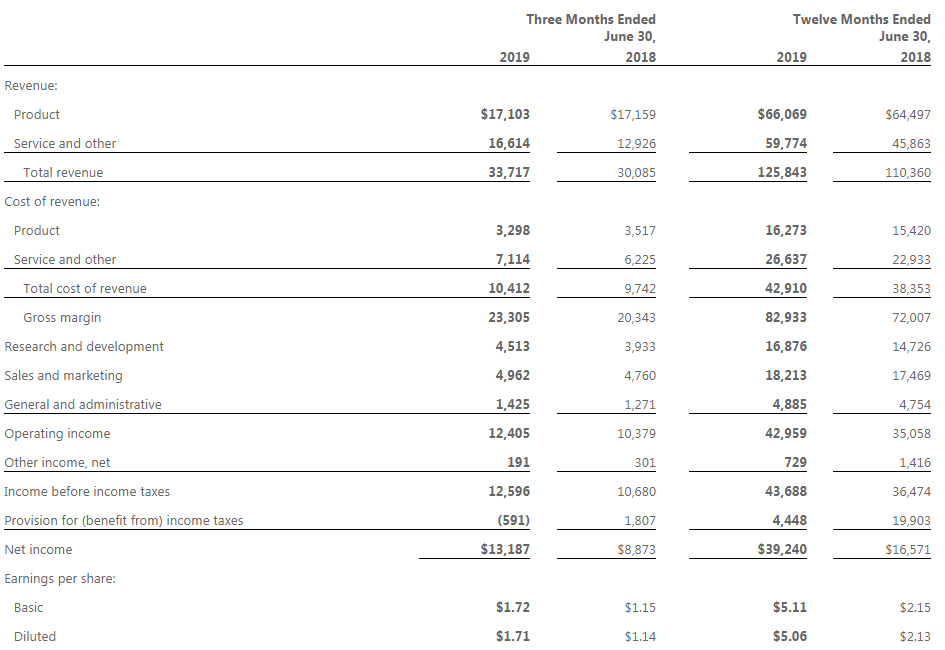 先说季度业绩,得益于云业务营收的持续增长和企业升级Windows系统的推动,19财年第四季度营收为337.2亿美元,同比上涨12%,远高于市场预估的327.8亿美元。净利润为131.87亿美元,较去年同期的净利润88.73亿美元增长49%,调整后净利润106亿美元,同比增速为21%。每股收益及调整后每股收益分别为1.71美元及1.37美元,同比增速分别为50%及21%,远高于分析师的预估1.22美元。