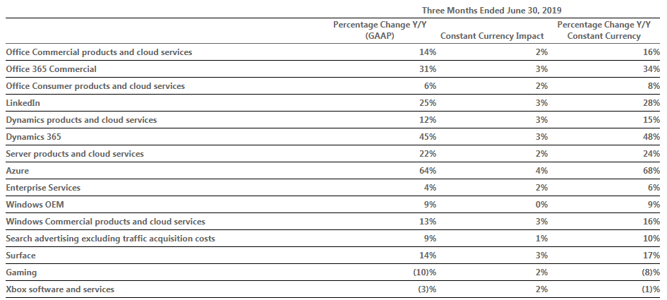 以业务及产品分类按固定汇率计算的同比增速如下图,公司下设三大部门,生产力与业务流程事业部(Productivity and Business Processes)包括前6项(从Office商用产品及云服务到Dynamics 365);智慧云业务事业部(Intelligent Cloud)分为服务器产品及云服务、企业服务,其中含高速增长的Azure云计算;个人计算事业部(More Personal Computing)包含最后几项产品服务,包括Windows OEM、搜索广告、Surface硬件及Xbox游戏软硬件收入。