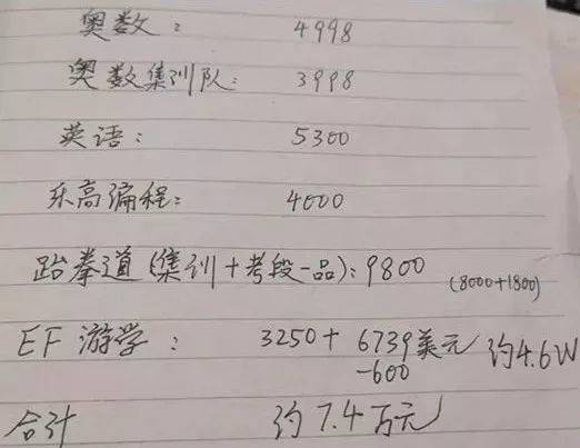 补习班+兴趣班+国内夏令营总消费:万元左右。