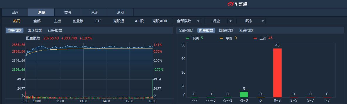 周五,恒指早盘高开0.43%,盘初快速走强,先后收复半年线,5日线等多条重要均线,午后维持在高位横盘震荡。截至收盘,恒生指数涨303.74点或1.07%,报28765.4点,全日成交额达675.85亿。国企指数涨1.16%,报10909.41点,红筹指数涨0.62%,报4454.56点。