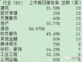 从上表可以明显的看到,医疗保健、纺织服饰最为出色,上市首日破发率为20%及以下;媒体娱乐、酒店行业表现最差,上市首日破发率分别高达75%和66.67%。建筑业在上市首日涨幅前十名里占据5席,而整个建筑行业过去一年上市的公司多达19家,上市首日的破发率也较低,为31.58%。