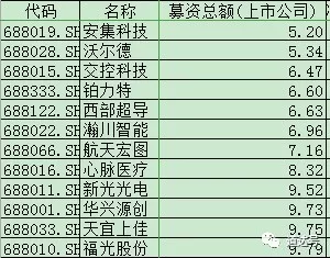 反观科创板首批上市的新股,按理说市值大小与募资金额成正相关关系,在此次上市中,募集资金少于10亿元的企业达到了12家(见下表)。