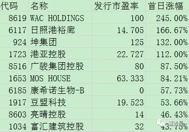 在上市首日涨幅最大的港股就是WAC HOLDINGS(08619,HK),发行价是0.2港元,而在上市首日WAC HOLDINGS就以0.355港元开盘,开盘后其股价一路上涨,最终以0.69港元报收,全天涨幅高达245%。另外需要关注的是,WAC HOLDINGS上市至今,已经涨至了目前的2.3港元,相比发行价,已经是一只不折不扣的十倍牛股。不过需要注意的是,即便过去一年上涨了如此多,而目前WAC HOLDINGS的市值也仅仅不到25亿港元,静态市盈率高达上千倍,TTM市盈率显示为亏损。