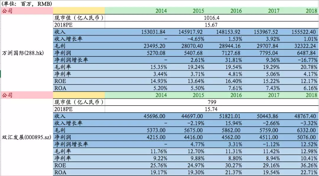 从2014年到2018年的财务数据来看,双汇发展的收入基本维持在450亿到500亿人民币的区间,净利润维持在40-50亿人民币,母公司万洲国际收入维持在220亿美元,净利润受美国业务影响波动比较大,在7.6亿-11亿美元之间,过去五年表现非常平淡,基本没啥增长。
