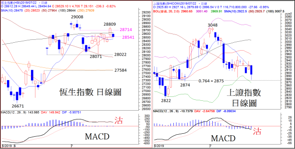 恆生指數的7月16日高位28634理論上是一個「神奇數字周期」轉捩點,但調整了兩個交易日之後,上周五即以大陽燭上破28634頂部、100天平均線及下跌裂口28541-28714阻力區高收,並促使MACD回復買入訊號。當看似會進一步上升之際,恆指今早卻低開153點,然後跌幅擴大至200多點,重返100天平均線支持28645之下。