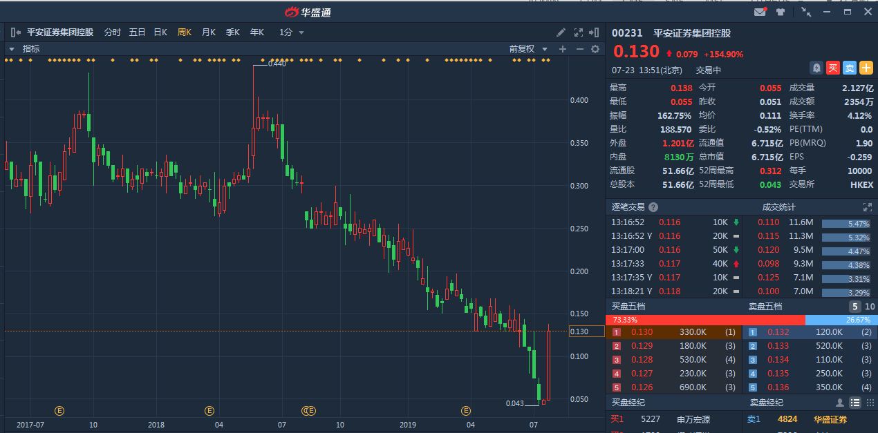 智通财经APP获悉,细价股平安证券集团控股(00231)股价暴涨,据悉公司是一家主要从事提供金融服务的香港投资控股公司。截至13时41分,涨154.9%,报价0.13港元,成交额2038万。