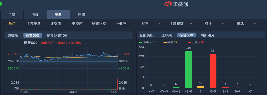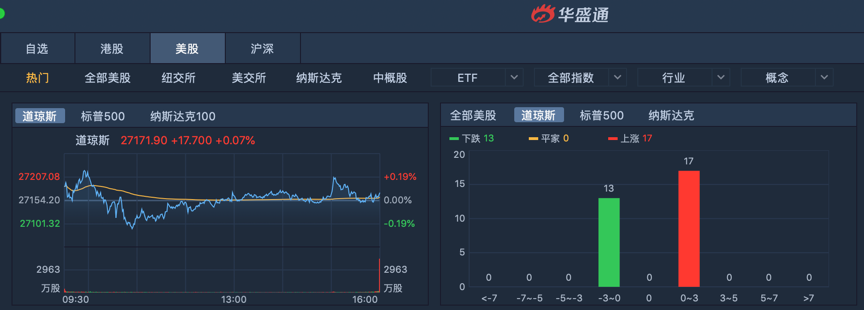周一,美股三大股指小幅高开后略有回落,最终微幅收涨。其中,道指涨0.07%,报27171.90点;标普500指数涨0.28%,报2985.03点;纳指涨0.71%,报8204.14点。