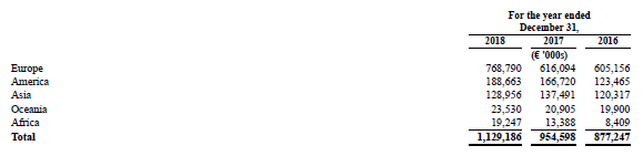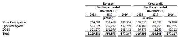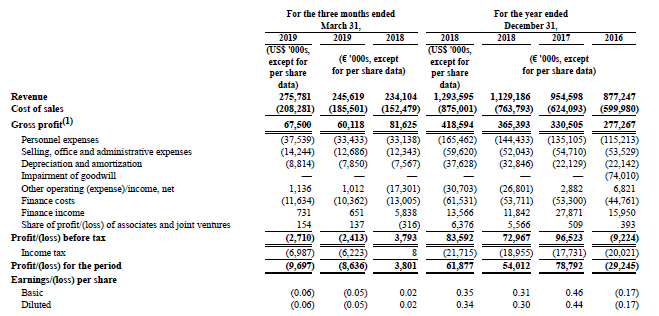 公司2018年、2017年和2016年的总营收分别为11.29亿欧元、9.55亿欧元、8.772亿欧元,增长率分别为18.22%和8.8%。毛利润分别为2.77亿、3.31亿和3.65亿欧元,毛利率为31.6%、34.6%和32.4%,基本保持稳定。