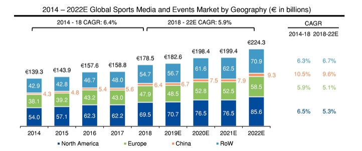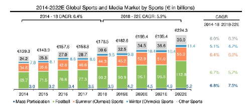 2018年全球体育媒体和赛事市场规模以收入计为1785亿欧元,预计2018至2022年将以5.9%的复合增长率增长。其中足球是年收入最大的体育项目,其增长可能会进一步受到优质联赛和亚太地区新兴市场的推动。