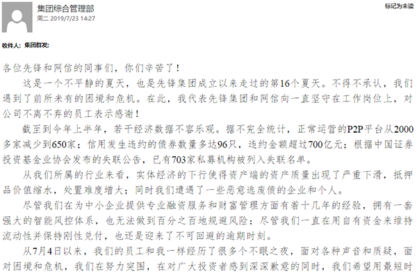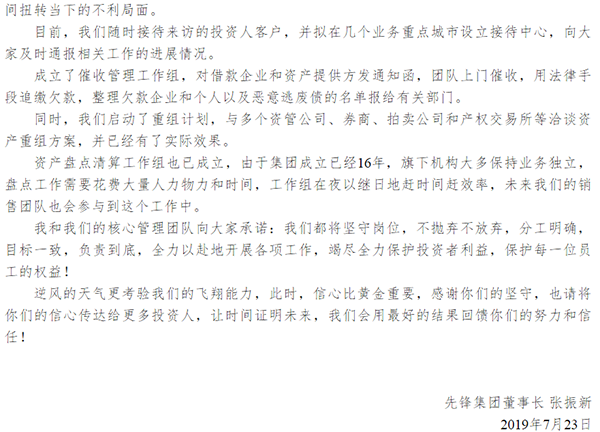 7月23日,先锋集团董事长张振新向全体员工发出内部邮件,表示集团遇到了前所未有的困境和危机,在对广大投资者感到深深歉意的同时,希望用最短时间扭转当下的不利局面。