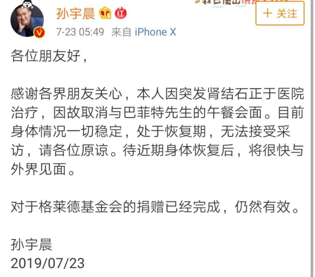 23日早间,孙宇晨发微博表示,“因其突发肾结石正于医院治疗,故取消与巴菲特先生的午餐会面 。目前身体情况一切稳定,处于恢复期,无法接受采访,请各位原谅。待近期身体恢复后,将很快与外界见面。对于格莱德基金会的捐赠已经完成,仍然有效。”