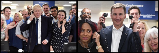 当地时间7月22日,英国伦敦,英国保守党党魁选举结果正式出炉前夕,两大热门候选人前外交大臣鲍里斯·约翰逊(左图中)、现外交大臣杰里米·亨特(右图中)来到保守党办公室呼叫中心造势拉票。 视觉中国供图
