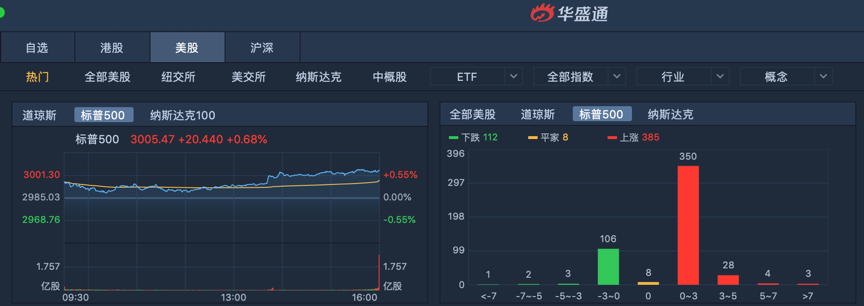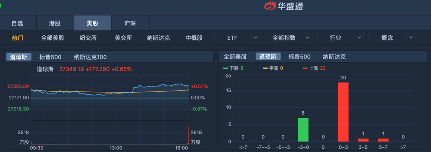 周二,受贸易谈判消息提振,美股三大股指小幅高开后有所回落,随后一路高走,其中道指涨0.65%,报27349.19点;标普500指数涨0.68%,报3005.47点;纳指涨0.58%,报8251.40点。