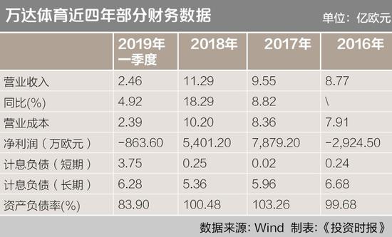 《投资时报》记者注意到,确如这位业内人士所言,万达体育的债务压力着实不轻。截至2019年一季度末,万达体育计息负债总额为10.03亿欧元,资产负债率达83.90%。其中,短期计息负债总额为3.75亿欧元,长期计息负债总额为6.28亿欧元。