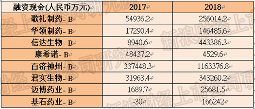 上市的8家公司2017财政年度及2018财政年度的融资现金所得,除了康希诺全为增长,平均同比增长超9000%,基石药业更从2017财政年度融资现金为负的情况下,2018财政年度融资现金流入1.67亿元,同比增长超55000%。