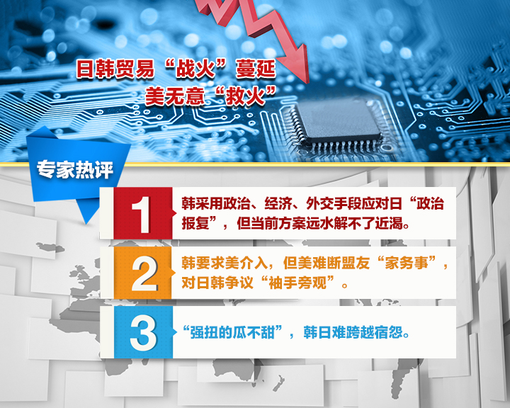 日韩经贸摩擦近日继续发酵,两国在世界贸易组织总理事会会议上展开激烈争论,日本还宣称要将韩国从其出口白名单中移除。日韩经贸摩擦到底弥漫出了怎样的火药味?两国关系正在面临怎样的考验?美高官访问日韩,为何对最迫切的贸易纠纷问题敬而远之,而是开出了“收费单”?如此避而不谈,美国这是要扮演怎样的角色?