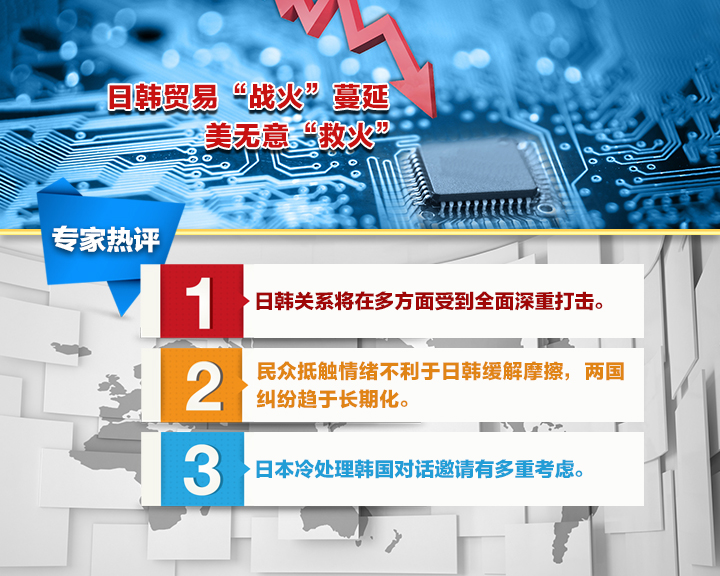 日韩经贸摩擦近日继续发酵,两国在世界贸易组织总理事会会议上展开激烈争论,日本还宣称要将韩国从其出口白名单中移除。日韩经贸摩擦到底弥漫出了怎样的火药味?两国关系正在面临怎样的考验?美高官访问日韩,为何对最迫切的贸易纠纷问题敬而远之,而是开出了“收费单”?如此避而不谈,美国这是要扮演怎样的角色?