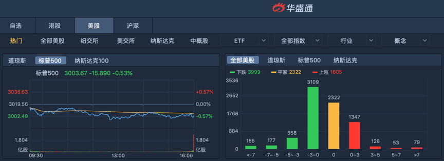 周四,美股三大股指集体收跌,其中,道指跌0.47%,报27140.98点;标普500指数跌0.53%,报3003.67点;纳指跌1%,报8238.54点。