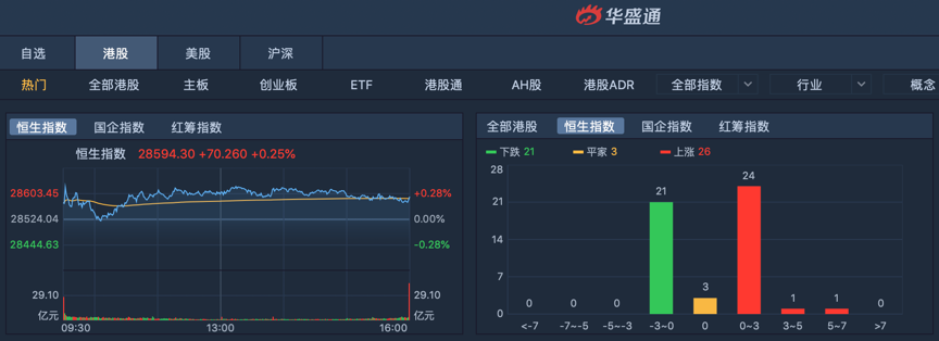 周二,恒指早盘高开0.18%后迅速下挫,随后略有回升,全天维持窄幅震荡。截至收盘,恒生指数涨0.25%,报28594.3点,全日成交额达680.59亿。国企指数涨0.66%,报10930.36点,红筹指数涨0.49%,报4445.52点。