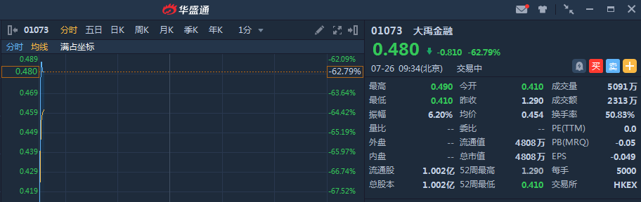 大禹金融(01073)首日低开68.22%,截止发稿,报0.48港元,暂成交2313万,最新总市值4808万港元。