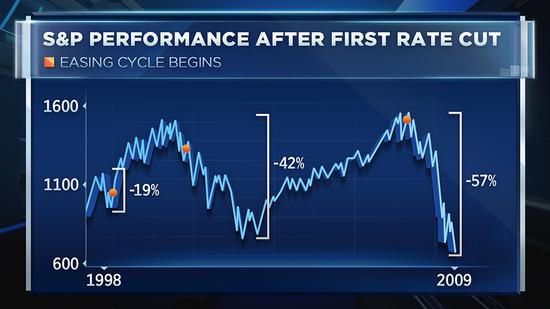 Suzuki建立的案例图表可以追溯到20多年前,它显示了标准普尔500指数在美联储宽松周期首次降息后的表现。